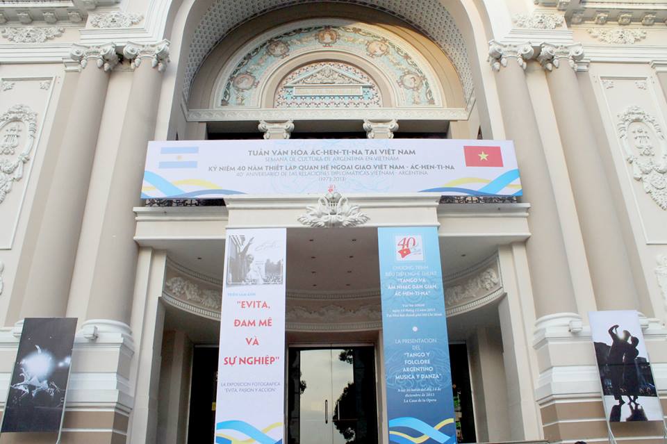 14-12-2013, Opera House (Ho Chi Minh). 17th December 2013, National Library (Hanoi). As part of the Cultural Week organized by the Argentine Embassy, two Photo Exhibitions about the life of Eva Peron were developed: "Evita, Passion and Action" in Ho Chi Minh City and "Eva Perón, Ambassador of Peace" in Hanoi. The images presented in both exhibitions featured the most important contributions of the "flag-bearer of the poor" to Argentina’s disadvantaged classes back in the mid-twentieth century. The Vietnamese large audience attending thus could understand the origin of the fraternal relationship between Evita and the working class.